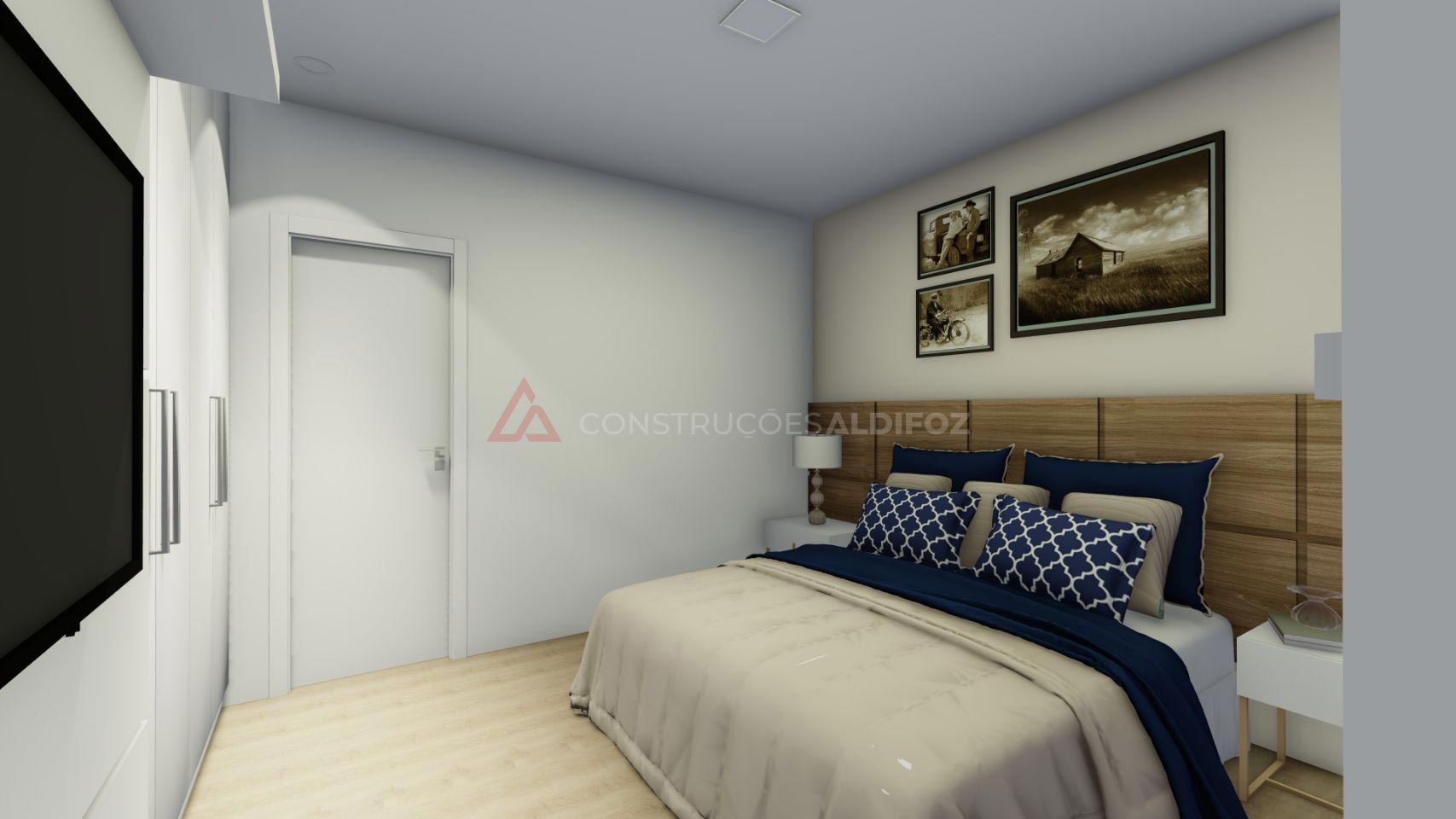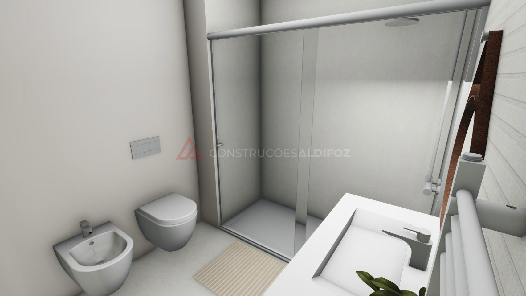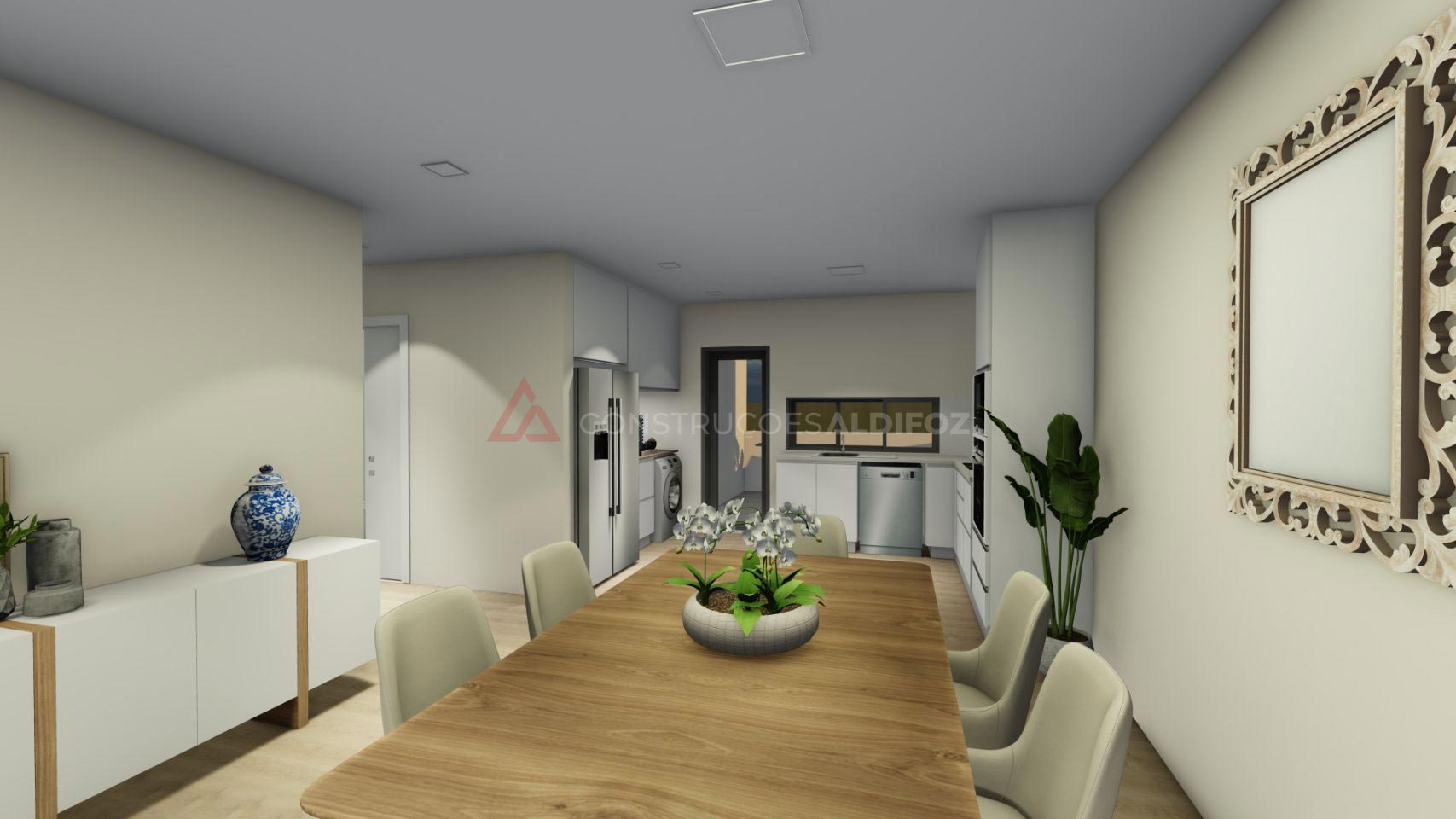- Carpintaria em termolaminado branco, roupeiros, cozinha e casas de banho